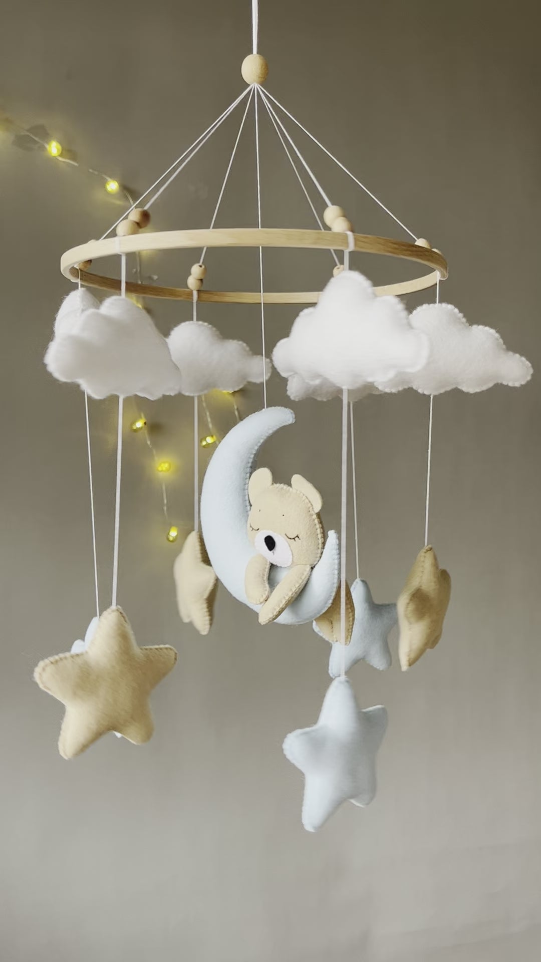 Baby mobile with sleeping/hanging bear, clouds and stars - Minidreams Decor