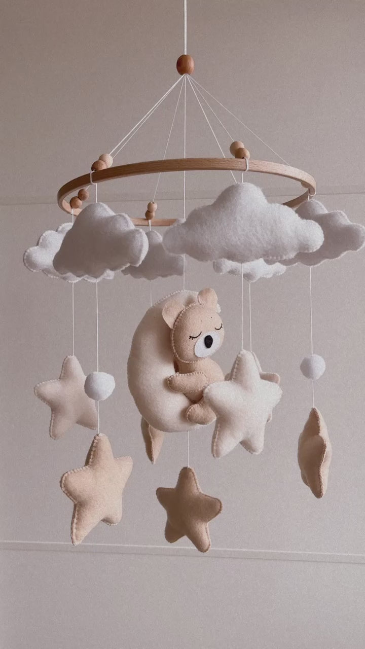 Sleeping bear mobile with beige and soft white stars, clouds and moon - Minidreams Decor